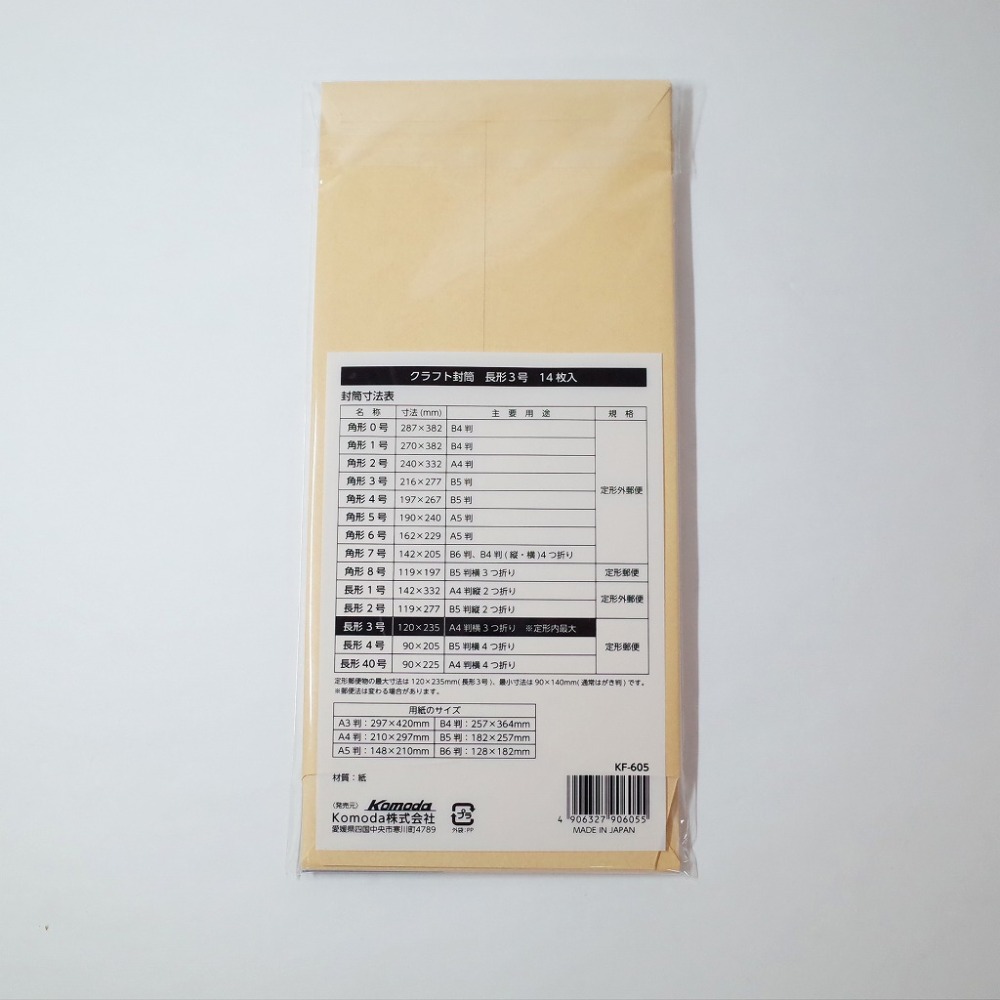 クラフト封筒 長形3号 14枚入[郵便番号枠なし] KF-605 / 12入